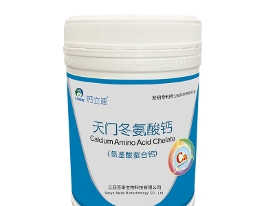 三亚百泰生物科技有限公司研发生产的天门冬氨酸钙是利用纳米流体磨设备,运用气穴崩塌原理,使天门冬氨酸和氢氧化钙充分进行乳化分散,纳米破碎。“钙立速”牌天门冬氨酸钙颗粒度达2-80纳米;充分溶于水;典型的分子型钙源,螯合结构稳定,可以被小肠粘膜细胞识别而直接整体吸收;不需维生素D3辅助吸收;不需要胃酸水解,不消耗胃酸,不会导致消化不良;且产品呈中性,对胃肠无刺激;重金属含量极低,远优于国家标准,无副作用;吸收率为90%以上。具有其他钙产品无法比拟的“四高”特性——高溶解、高吸收、高利用,高安全,满足了现代人体对钙的需求。